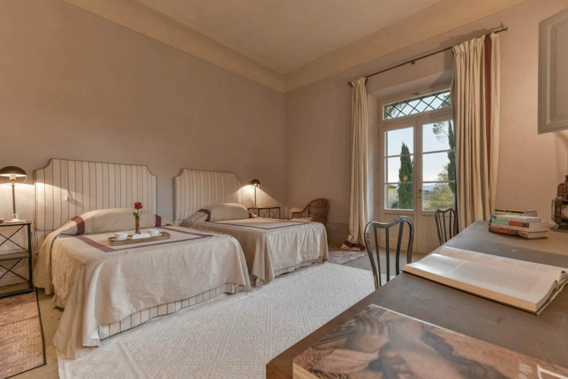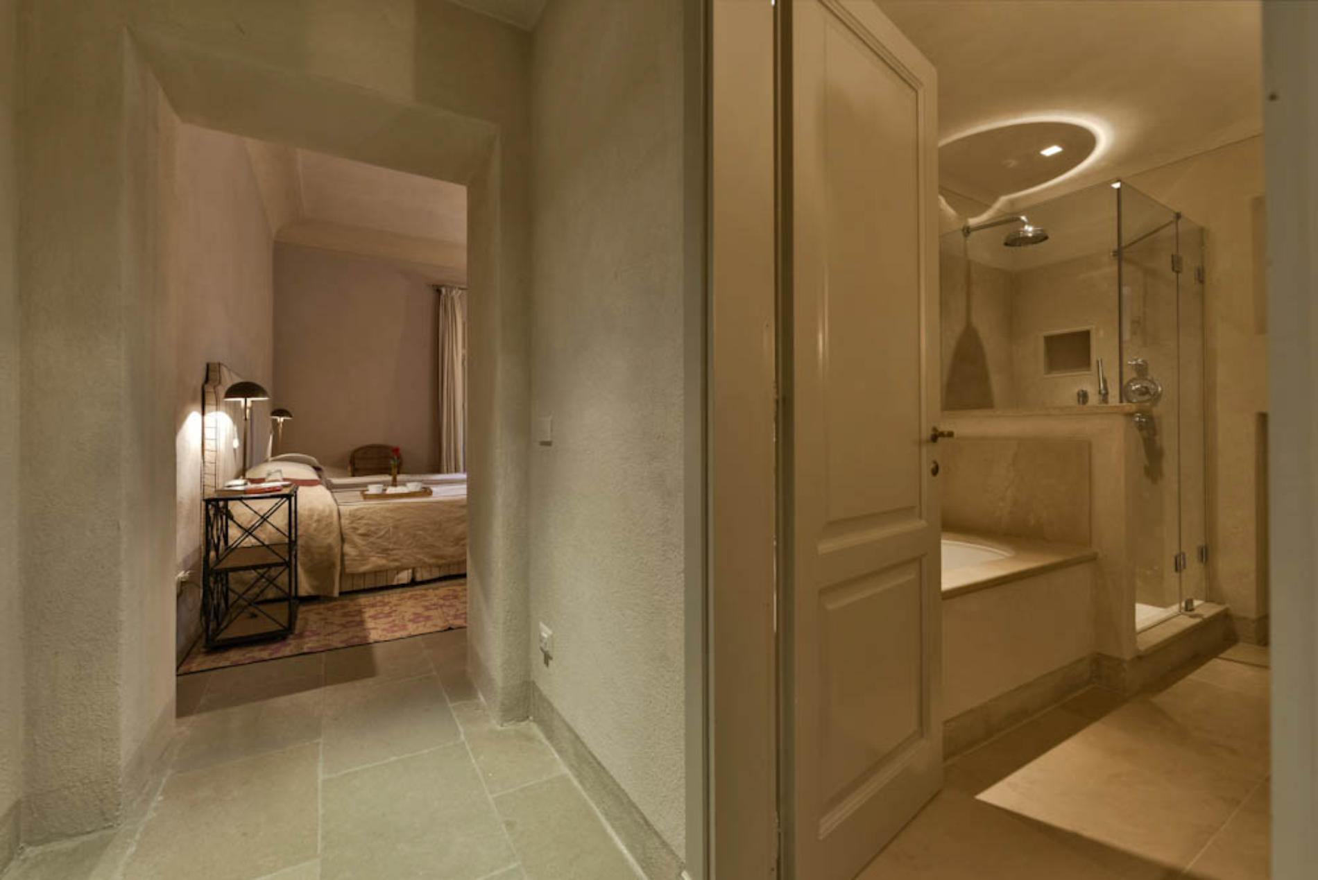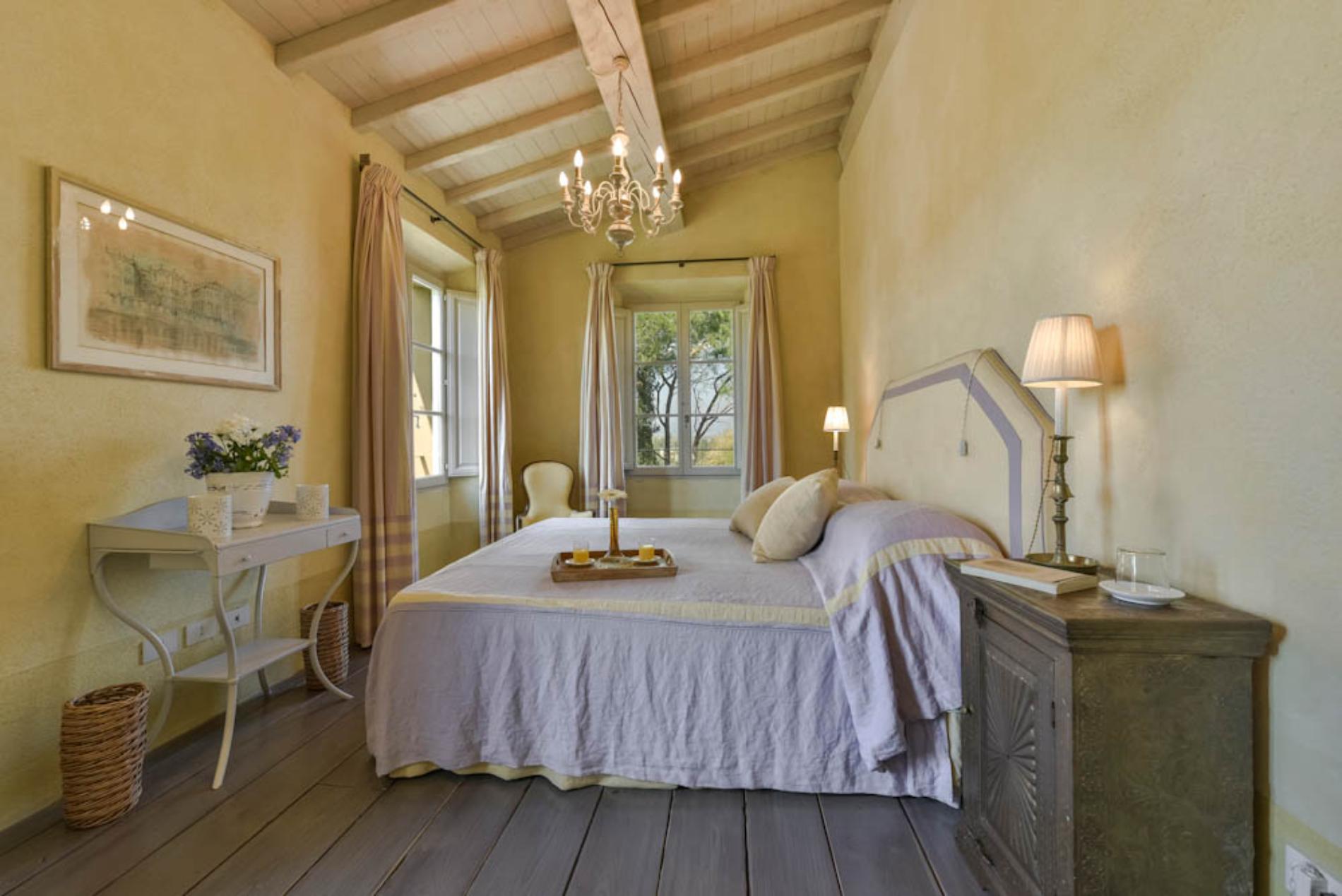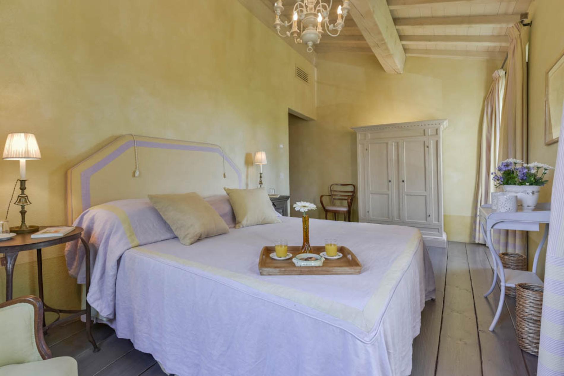 Corner bedroom with rooftop access and spectacular views of the far off hilltown of Roccastrada, Scarlino. Views of the silo spa, pool and La Vigna.