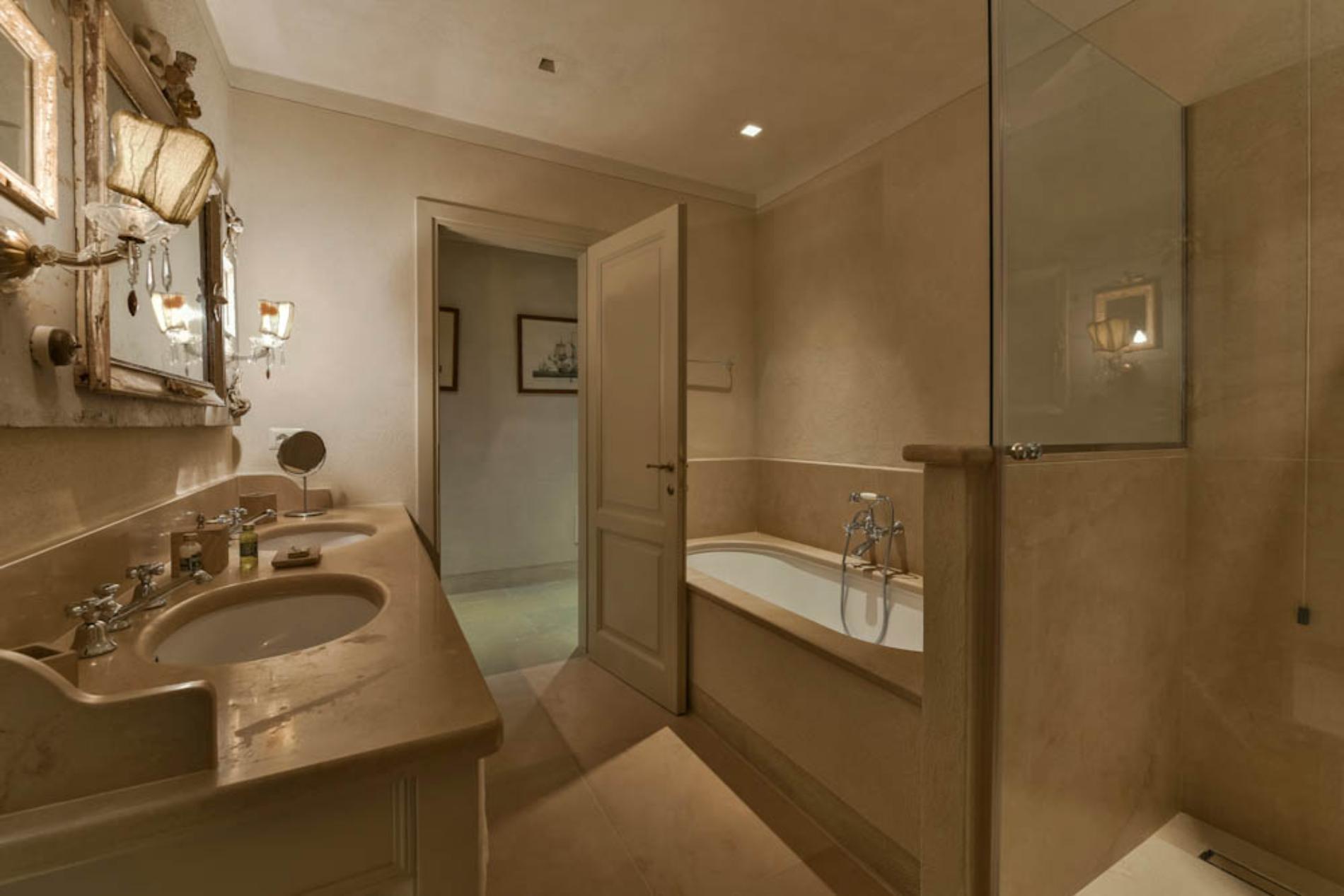 Queen size bed with en suite bathroom with double sink, shower and separate bathtub. WC and bidet
