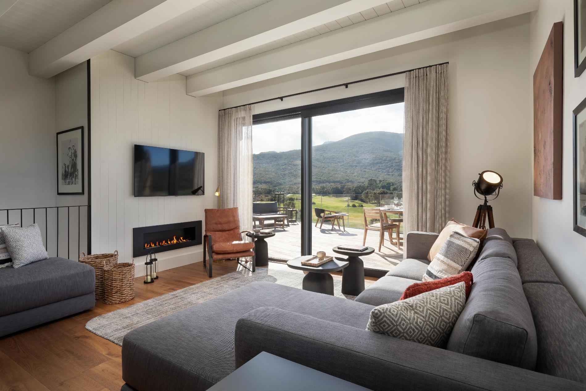 - Living room with dining area, bio-ethanol fireplace, and 55” Smart TV.