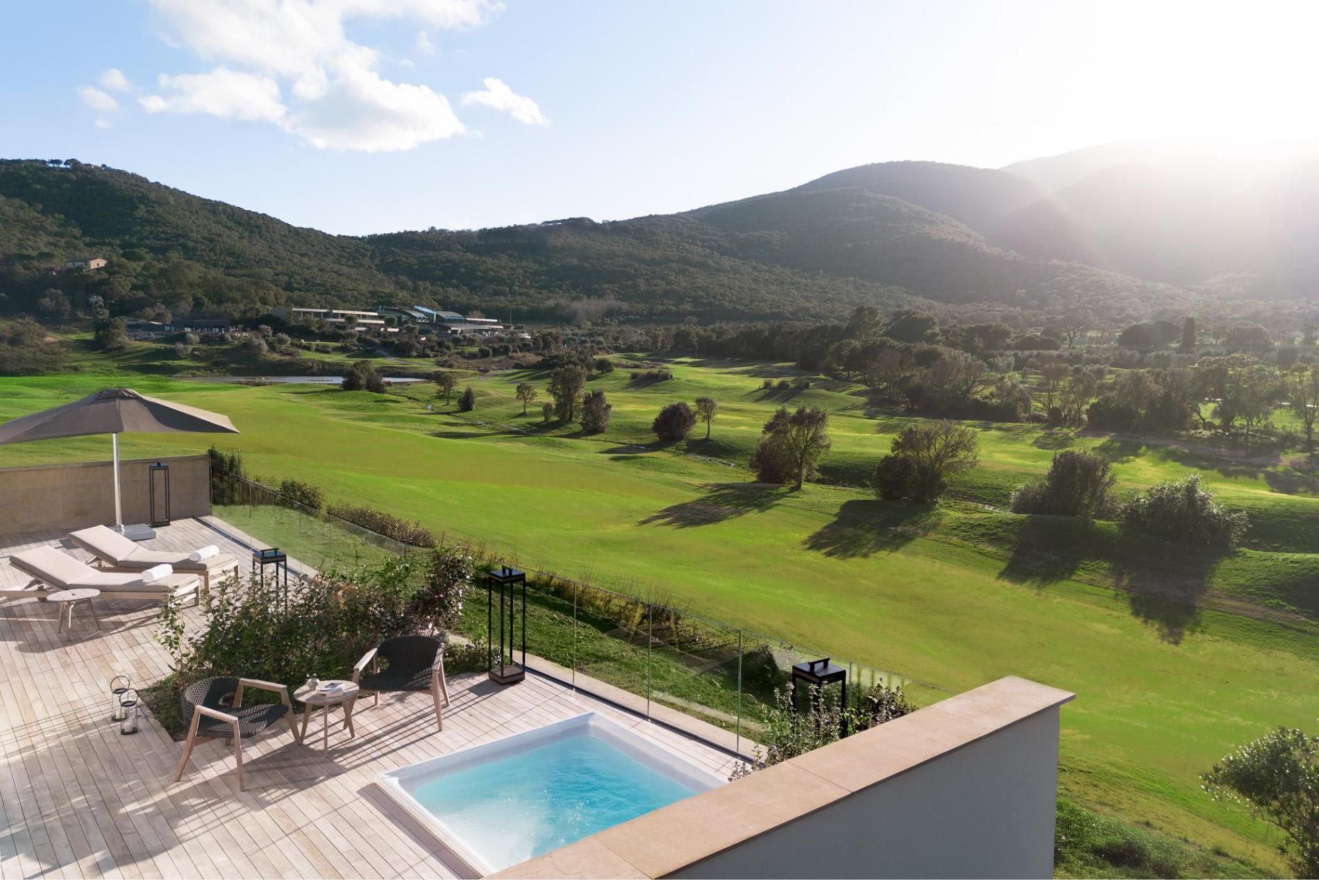 About Golf & Wellness Resort, it is nestled in a verdant valley near Porto Ercole, Southern Tuscany, only 90 minutes from Rome International Airport. It is a luxury, environmentally-friendly resort with the PGA National Golf Course Italy, a wellness center, and 2 Mediterranean restaurants. Other sports facilities include tennis and padel courts, jogging trails, a small football pitch and a modern gym.