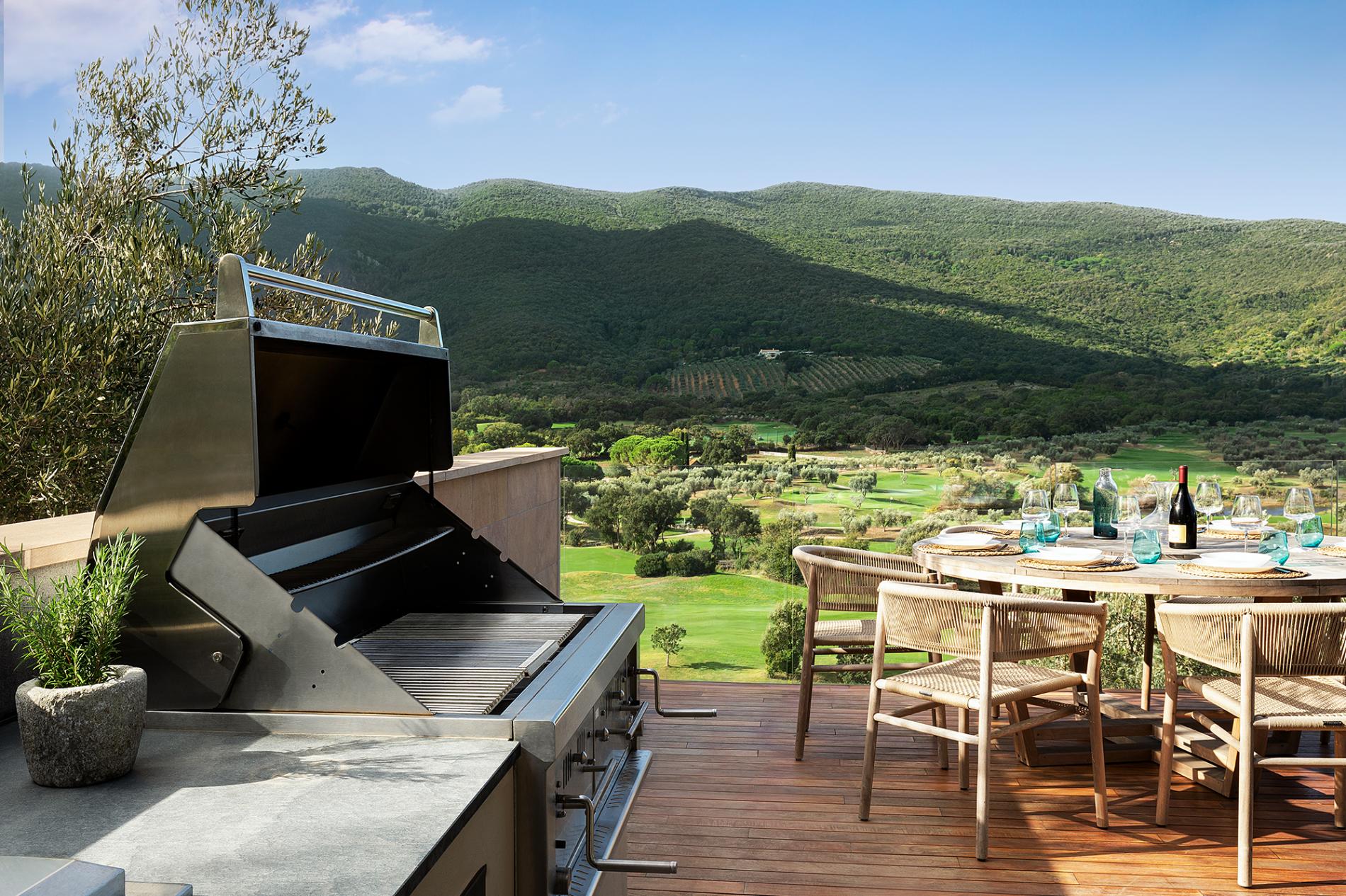 - Terrace with glass railings, barbecue, and Novellini outdoor hot tub.