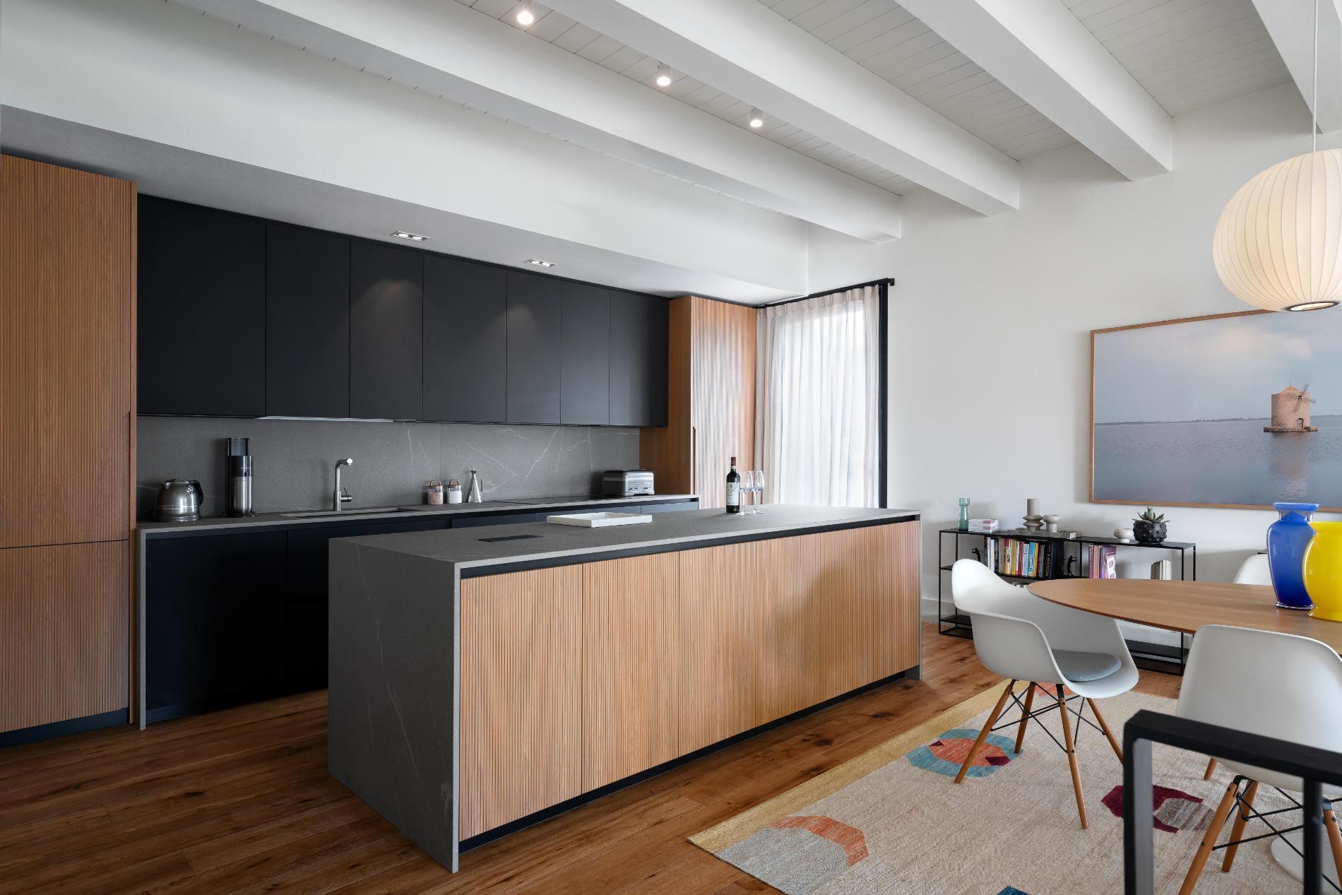 - Kitchen with Italian furnishings, equipped with an oven, refrigerator, dishwasher, microwave, coffee machine, kettle, and toaster.