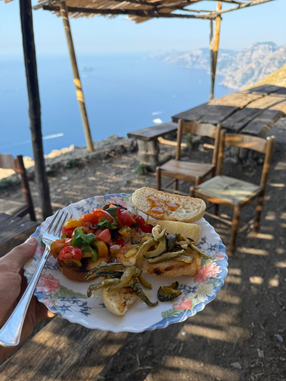 Our dog walking with us all the way and we had no problem. We could even take her to the restaurant. So hiking the path of gods with a dog, that is used to walking a bit, it’s not a problem. Just beware that the path is in direct sunlight. So in the summer with your dog start early in the morning or late in the evening, to avoid the worst weather. And don’t forget to take water and some treats for dog to recharge his energy. And slowly we returned to Bomerano, where our hike ends.